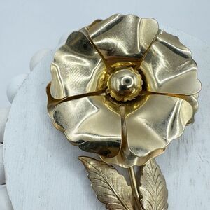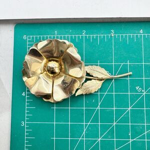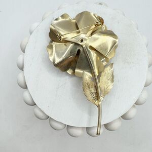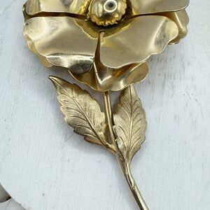 Vintage Gold Tone Large Rose Flower With Stem And Leaves Brooch Pin Grandmacore
