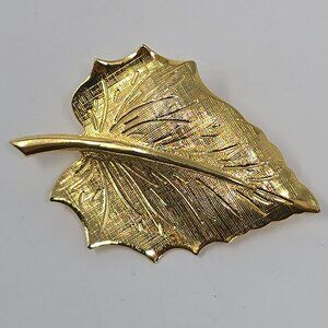 Vintage Gold Tone Leaf Brooch Pin Textured Mid Century Fall Autumn Jewelry