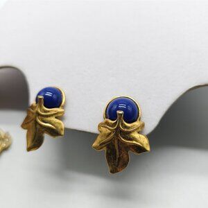 These earrings blend vintage charm with timeless elegance. Featuring a gold leaf design and bold blue cabochon, they offer a striking accessory for professional or formal attire.