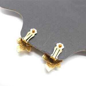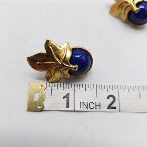 Vintage Gold Tone Leaf High End Clip On Earrings Blue Cabochon Accent 1.5 Inch