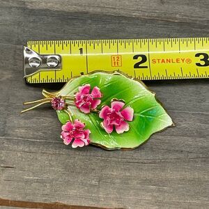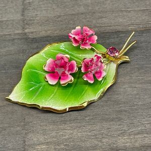 Vintage Gold Tone Leaf w/ Green Enamel Pink Flowers Brooch Marked Austria