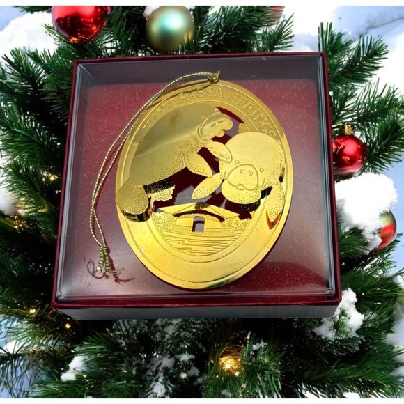 A charming addition to holiday décor, this gold-tone ornament features intricate manatee designs, highlighting the beauty of Homosassa Springs' wildlife.