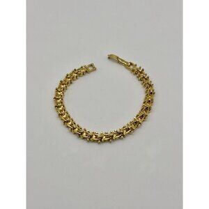 This lovely vintage tennis style bracelet is made of gold tone metal with a shiny finish, set with 4mm faceted faux sapphires and 4mm faceted faux diamonds. Each stone is separated by gold tone "s" shaped elements. The bracelet measures 7 inches long, is signed "Korea" on the back of the clasp, and is in excellent condition.