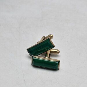 These vintage cufflinks, featuring a striking green onyx inlay set in a classic gold-tone finish, add a refined touch to formal wear. The rectangular design offers a timeless appeal and a sophisticated look, perfect for elevating a professional wardrobe.