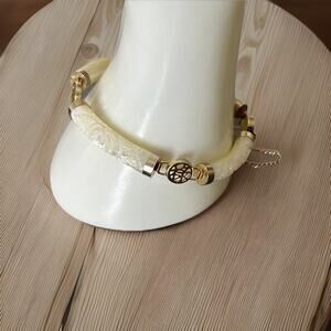 Bracelet is a gold tone bar and link with safety chain.