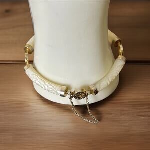This vintage gold tone carved mother of pearl bar and link bracelet and necklace set exudes elegance and charm. The intricate design, featuring a spring ring closure, showcases a classic chain style with a unique bar-shaped mother of pearl pendant. The timeless combination of white mother of pearl against the golden backdrop of the vintage design makes it a sophisticated accessory for any woman's jewelry collection. The necklace measures a luxurious 16 inches in length, adding a touch of glamour to any outfit with its vintage appeal.