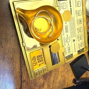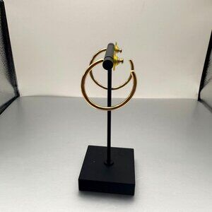 Gold tone open hoop earrings with a sleek minimalist design. Bright polished finish with light surface wear from normal use. Posts are straight, and silicone disc backs are included for secure wear. A lightweight, modern pair that works well for everyday outfits or elevating a simple look.