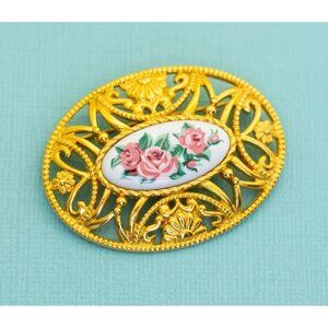 Vintage Gold Tone Oval Flower Porcelain Brooch by Avon - E1