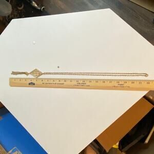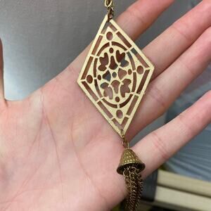 Really pretty necklace in good used condition. Features a double clasp with chain and a small bell hanging from pendant with 5 small tassel chains. 22 inches total length