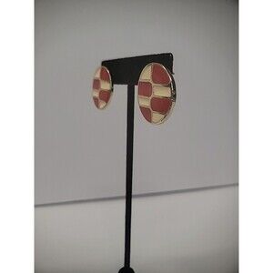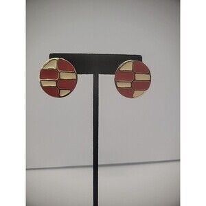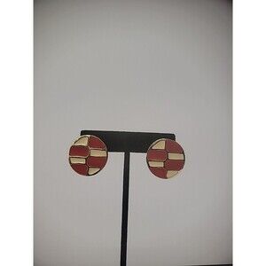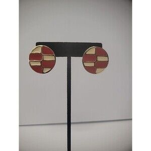Vintage Gold Tone Pierced Earrings Stud Womens Red Beige Pattern Jewelry Costume