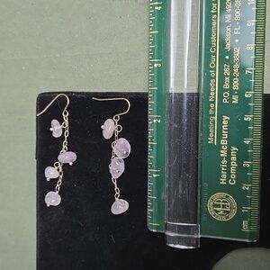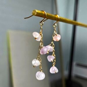 These elegant dangle earrings feature delicate pink stones set in a gold chain. Perfect for adding a touch of sophistication to any outfit.
