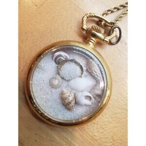 Vintage Gold Tone Pocket Watch Pendant Necklace Beach Sand Real Shells Ocean Art