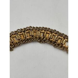 It measures approx 7” long and approx 7/8" wide. It has the heraldic style flared end caps with fold over clasp. It is in good wearable condition.