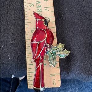 This is a beautiful vintage brooch featuring a gold tone cardinal bird with red enamel and green leaves. It is in excellent condition. The brooch is unmarked and measures 2.75 inches. It is the perfect addition to any jewelry collection or a thoughtful gift for a bird lover. It is in excellent condition and ready to wear. This beautiful brooch will definitely bring a touch of elegance and charm to any outfit.