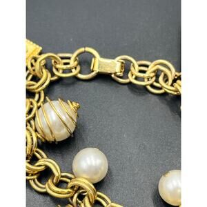 Vintage Gold Tone Revival Moghul Pearl Medallion Charm Etruscan Bracelet