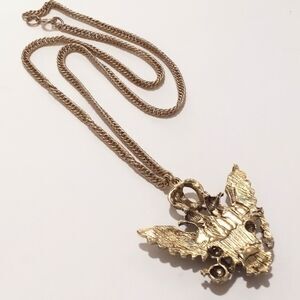 The pendant measures approximately 1 3/4" long by 1 7/8" wide and is suspended from a 20" gold tone chain that fastens securely with a classic spring clasp. A standout piece that blends vintage charm with statement style—perfect for collectors and lovers of unique costume jewelry.