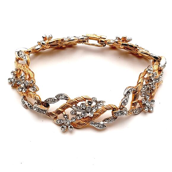 Vintage Gold Tone Rhinestone Floral 6 1/2 Inch Bracelet