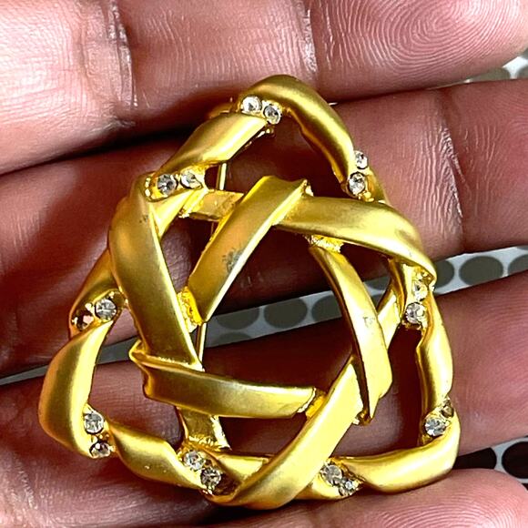 Add a touch of vintage elegance to your outfit with this stunning gold-tone brooch! ✨ Featuring sparkling rhinestones in a classic triangle design, this lapel pin is the perfect accessory for any occasion. Whether you're dressing up a blazer or adding flair to a scarf, this brooch will make a statement. Don't miss out on this timeless piece! B#18