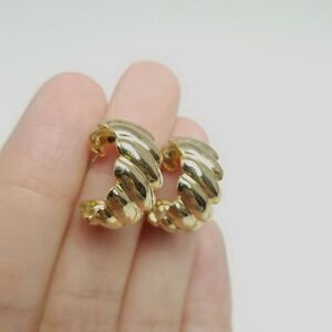 Vintage Gold Tone Ribbed Hoop Earrings, Stud Huggie Style, Estate