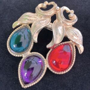 Gold tone party brooch with multi-colored tear drop shaped gems.