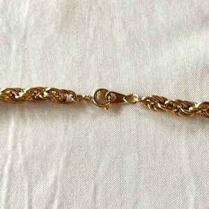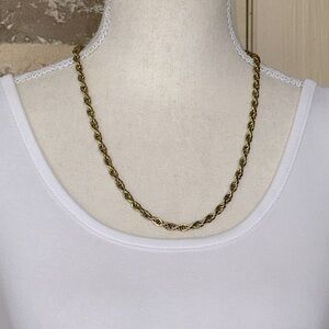 Elevate your style with this classic vintage gold tone rope chain necklace. Measuring a versatile 24 inches in length, this chain features a twisted rope design that catches the light beautifully, adding a touch of elegance to any outfit. It's perfect for layering with other necklaces or wearing on its own as a statement piece. A timeless accessory that complements both casual and formal wear. Approximate length in photos. Minimal wear.