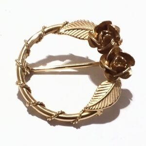Vintage Gold Tone Rose Accented Mid Century Circle Pin Brooch
