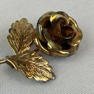 This vintage gold tone rose brooch pin features intricate leaf detailing, offering an antique charm. Its elegant design makes it a timeless accessory, suitable for enhancing any outfit with a touch of vintage sophistication. A delightful piece to add to any jewelry collection, showcasing exquisite craftsmanship and classic style.