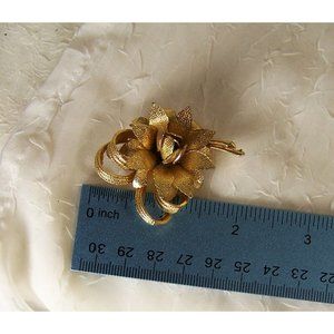 Vintage Gold Tone Rose Flower Brooch Textured Pointed Leaves 2"