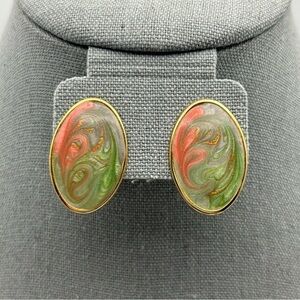 Vintage Gold Tone Round Oval Green and Pink Swirl Stud Pierced Earrings