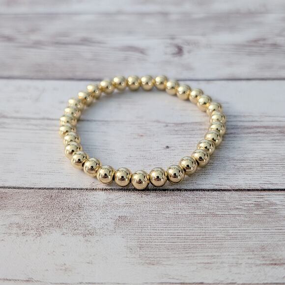 Inner circumference measures a bit under 6" unstretched. Beads have weight to them. I am not sure of the material but they could be some sort of metal. Nice firm stretch to the cord. Very yellowy gold tone.