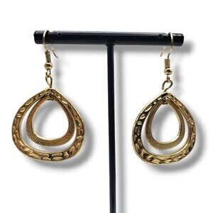 Vintage Gold Tone Textured Concentric Teardrop Dangle Drop Hook Earrings