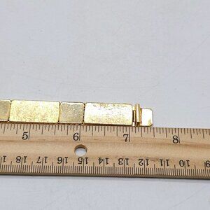 This bracelet offers a sophisticated design with textured rectangular links in a gold-tone finish. Ideal for complementing formal or business attire.