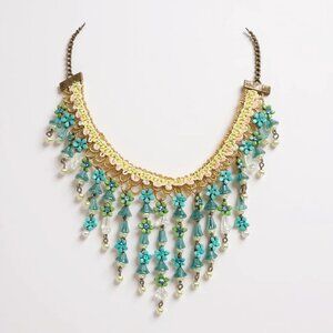 Vintage Gold Tone Thread Multi Blue Bead And Flower Gradual Dangle Necklace