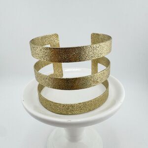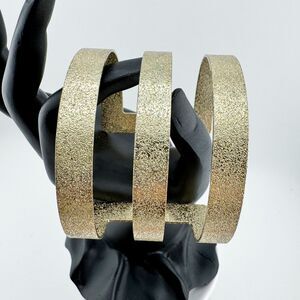 This textured gold cuff bracelet makes a bold and elegant statement with its wide, triple-band open design that wraps gracefully around the wrist. Crafted in a shimmering matte-gold finish, it blends modern glam with minimalist sophistication, creating a look that feels both contemporary and timeless. Perfect for adding a touch of editorial-style luxury, this piece pairs beautifully with sleek eveningwear, cocktail dresses, or even a crisp white blouse and jeans for effortless high-fashion flair. Whether worn solo as a standout cuff or layered with bangles for a runway-inspired look, it captures the essence of vintage glam meets modern edge.