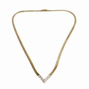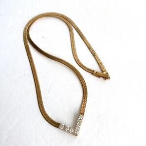 Vintage Gold Tone V Necklace CZ Herringbone