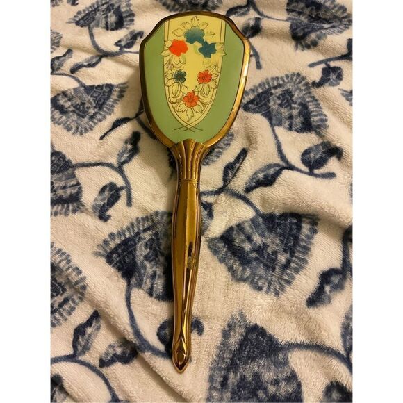 Vintage Gold Tone Vanity Hair Brush w/ Floral Design on back