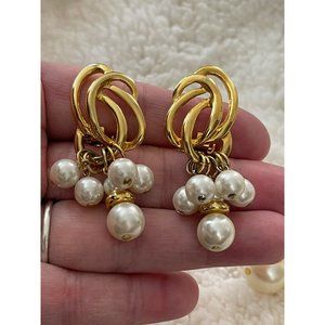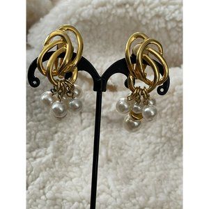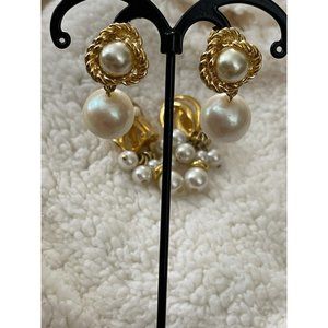 Vintage Gold Tone White Dangle Bead Clip-On Earrings - 2 Pairs. Measurements in pics. Beautiful Earrings! Preowned, better than normal wear/use. No damage, discoloration or breaks. Clean, smoke-free home. Fashion Jewelry