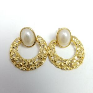 Vintage Gold Tone and Faux Pearl Door Knocker Style Stud Earrings, Retro 80s