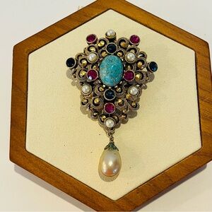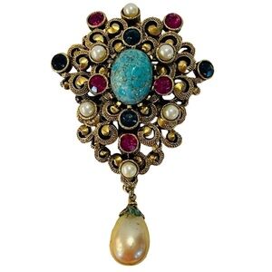 Vintage Gold Tone and Turquoise Brooch with Pearl Drop
