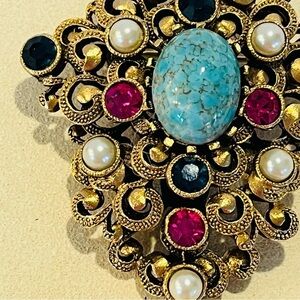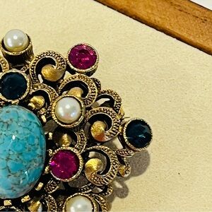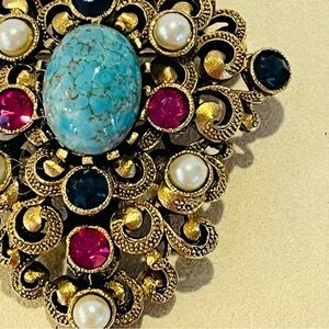 Elegant vintage brooch featuring a stunning turquoise centerpiece, surrounded by gold accents and pearl embellishments. Perfect for adding a touch of sophistication to any outfit.