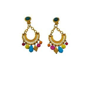 Imagine adorning your ears with a vibrant piece of artistry. These vintage clip-on earrings feature a tropical style with cascading blue, yellow, pink, and orange glass beads beautifully arranged on a gold wire framework. Lightweight yet statement-making, they add an artistic touch to both casual and formal outfits.