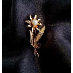 This is a beautiful vintage brooch featuring a delicate gold-tone floral design. The flower is adorned with a faux pearl as the centerpiece, complemented by a sparkling clear rhinestone on the leaf. The textured gold-tone finish adds elegance and charm to this timeless piece. Perfect for collectors or as a statement accessory for any outfit.