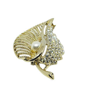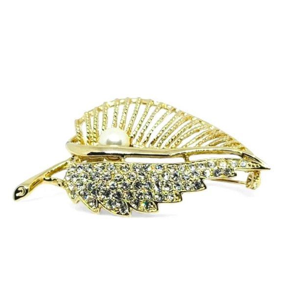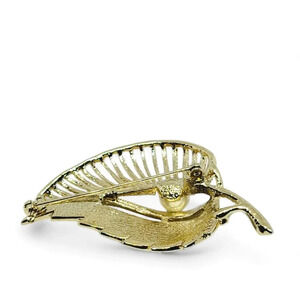 Beautiful gold toned leaf brooch with small sparkling rhinestones and lovely gold tone faux pearl.