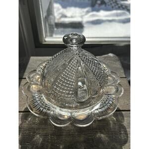 This butter dish comes with a convenient covered lid, ensuring your butter stays fresh and presentable for any occasion. Although the country of origin remains a mystery, this item's handmade counterpart is just as impressive, weighing in at a substantial 2 pounds 5 ounces, confirming its quality and durability. Perfect for collectors and home chefs alike, this dish is a true vintage gem.