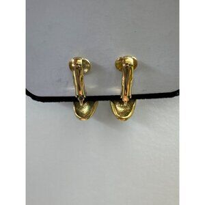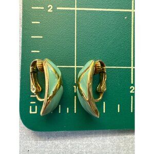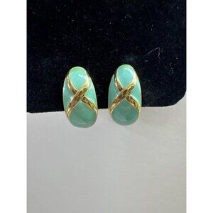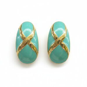 These vintage clip-on earrings feature a striking turquoise enamel with gold-tone accents, offering a timeless and elegant look suitable for various occasions. Their classic design ensures they remain a versatile accessory in any jewelry collection. Ideal for those who appreciate vintage style with a modern twist.