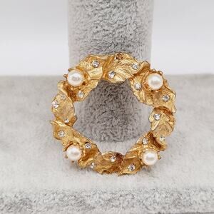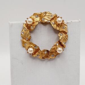 This is a lovely vintage gold plated wreath brooch featuring textured leaf details, sparkling clear rhinestones, and four creamy faux pearls. The brooch measures approximately 1 1/2 inches and has a classic mid-century look that complements coats, scarves, hats, and holiday outfits beautifully.