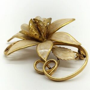 This exquisite floral brooch features a stunning combination of gold and cream tones, perfect for adding a touch of elegance to any outfit.
