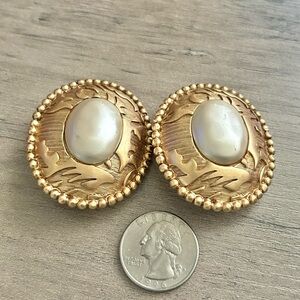 These elegant earrings feature a stunning detailed vintage/antiqued design with a pearl center.