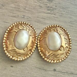 Vintage, ClipOnEarrings, Gold, Pearl, FauxPearl, LargeEarrings, StatementEarrings, Jewelry, WomensJewelry, VintageJewelry, Retro, CostumeJewelry, Glam, HollywoodGlam, ChunkyEarrings, ButtonEarrings, Ornate, Filigree, TexturedGold, NonPierced, 80sVintage, 90sVintage, Formal, Accessories, GiftIdea