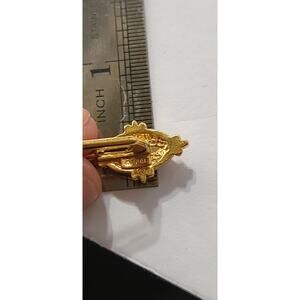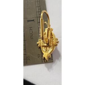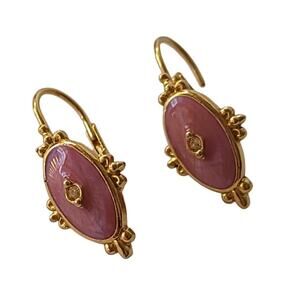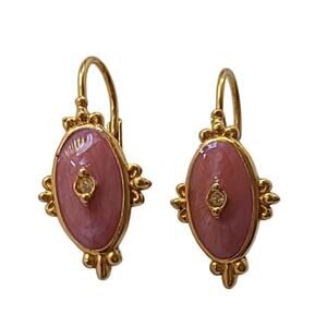 These vintage earrings are designed with a classic leverback closure and feature a beautiful pink enamel inlay. The inlay is set within a gold-tone frame, adorned with small gold-tone decorative elements at the top, bottom, and sides, giving them an elegant and timeless look. The center of the enamel inlay has a small, clear rhinestone accent, adding a touch of sparkle to the earrings.